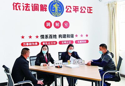 2021年3月28日,新疆阿勒泰市人民法院司法輔助中心工作人員在調解矛盾糾紛。新華社發