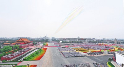 慶祝中國(guó)共產(chǎn)黨成立100周年大會(huì)開(kāi)始前的飛行慶祝表演。?新華社發(fā)