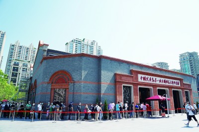游客在上海中共一大紀念館前排隊等待參觀。新華社發