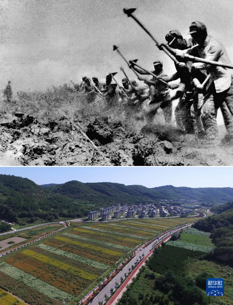 這是一張拼版照片,上圖為:抗日戰爭期間,八路軍三五九旅在南泥灣開荒生產(資料照片);下圖為:2020年8月25日拍攝的延安南泥灣景色(無人機照片,祁小軍攝)。新華社發