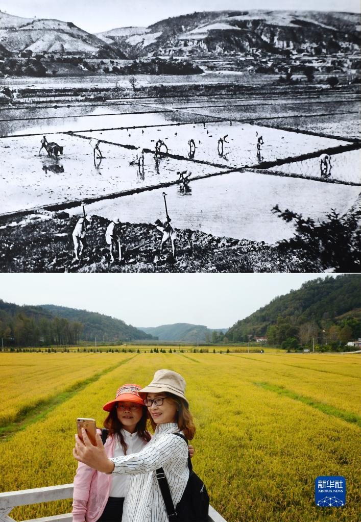 這是一張拼版照片,上圖為抗戰時期延安南泥灣的生產場景(資料圖片);下圖為2018年9月12日,游客在延安南泥灣稻田旁留影(新華社記者劉瀟攝 )。新華社發