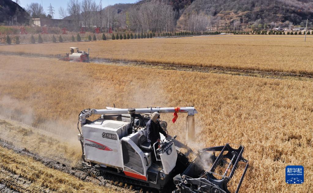 收割機在延安市南泥灣鎮收割水稻(2020年10月23日攝,無人機照片)。新華社記者 陶明 攝