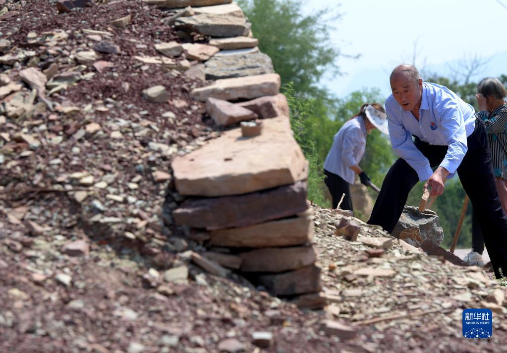 在林州市任村鎮盤龍山村,王生有(前)帶領村民清理亂石,維護道路(2019年7月3日攝)。新華社記者 李安 攝