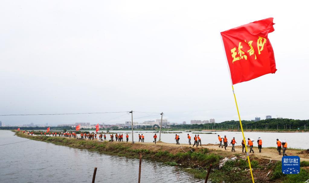 陸軍第71集團軍某合成旅王杰生前所在連官兵跟隨部隊在江西共青城市共青聯(lián)圩共大圩段加固防洪堤壩(2020年7月19日攝)。新華社發(fā)(李志浩 攝)