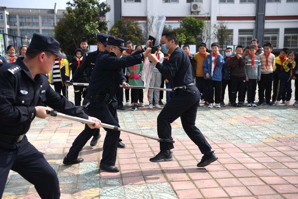 4月12日,肥西縣公安局銘傳派出所民警在銘傳鄉中心學校開展防暴演練。
