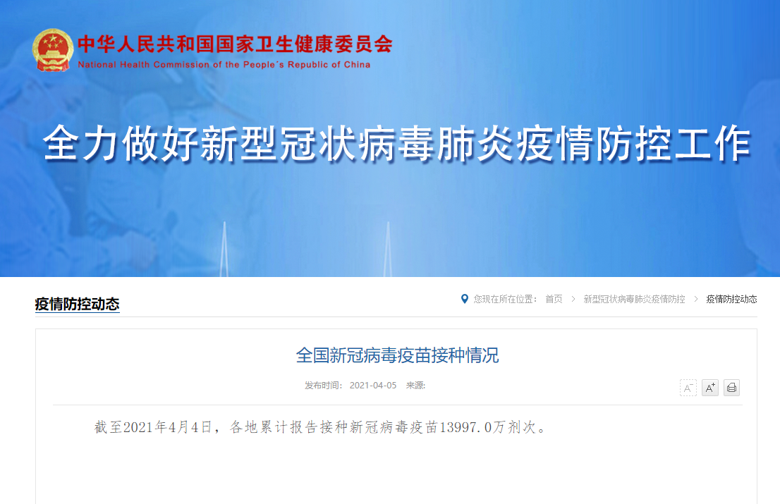 截至2021年4月4日,各地累計報告接種新冠病毒疫苗13997.0萬劑次。(總臺央視記者 史迎春)