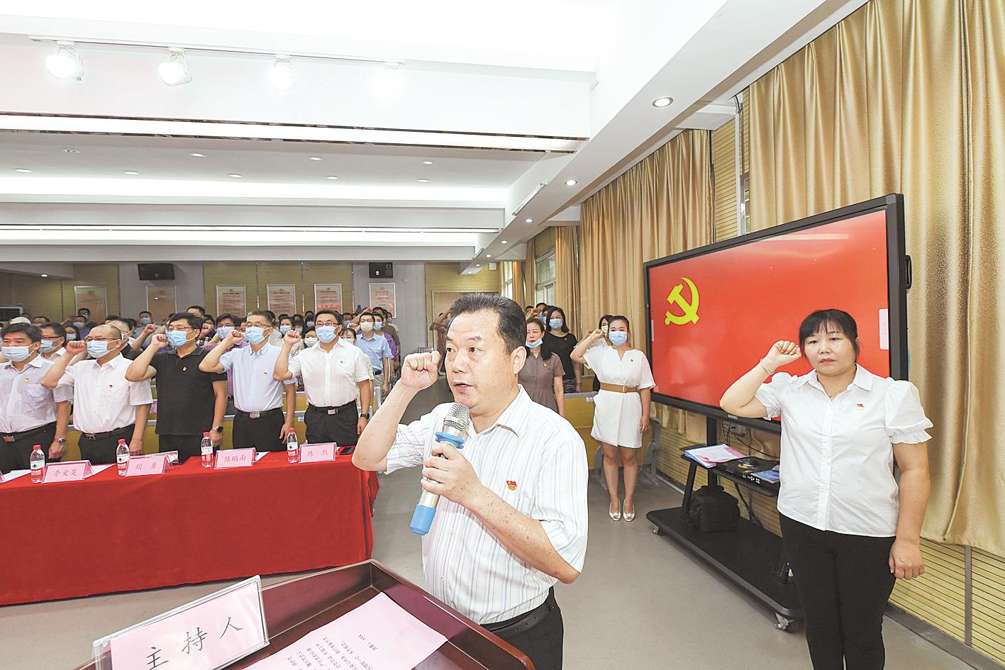 2020年8月2日,武漢市武昌區(qū)凱樂花園小區(qū)綜合黨委成立,來自省市區(qū)各級機(jī)關(guān)企事業(yè)單位的80多名下沉黨員和小區(qū)黨員重溫入黨誓詞。 ? ?2020年6月起,我省全面推行機(jī)關(guān)企事業(yè)單位黨組織和黨員干部“雙報(bào)到”制度,壯大了社區(qū)治理力量,形成小區(qū)治理合力。(湖北日報(bào)全媒記者 陳勇 攝)