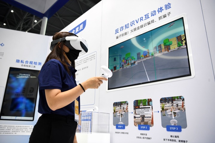 9月4日,一家參展企業代表在演示反詐知識VR互動體驗項目。新華社記者 劉軍喜 攝