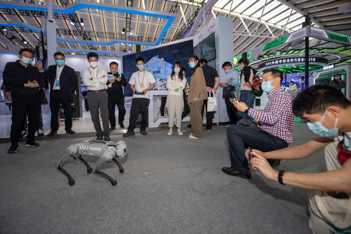 11月10日,觀眾在博覽會上參觀機器狗表演。 新華社記者 江漢 攝