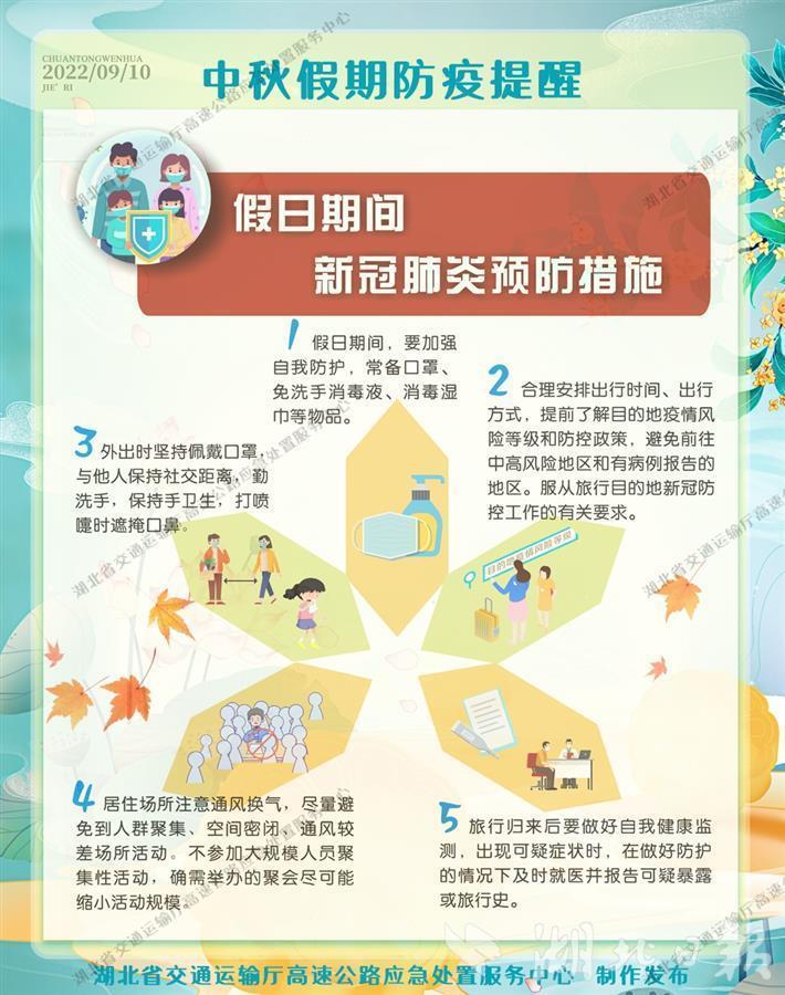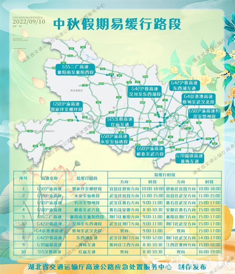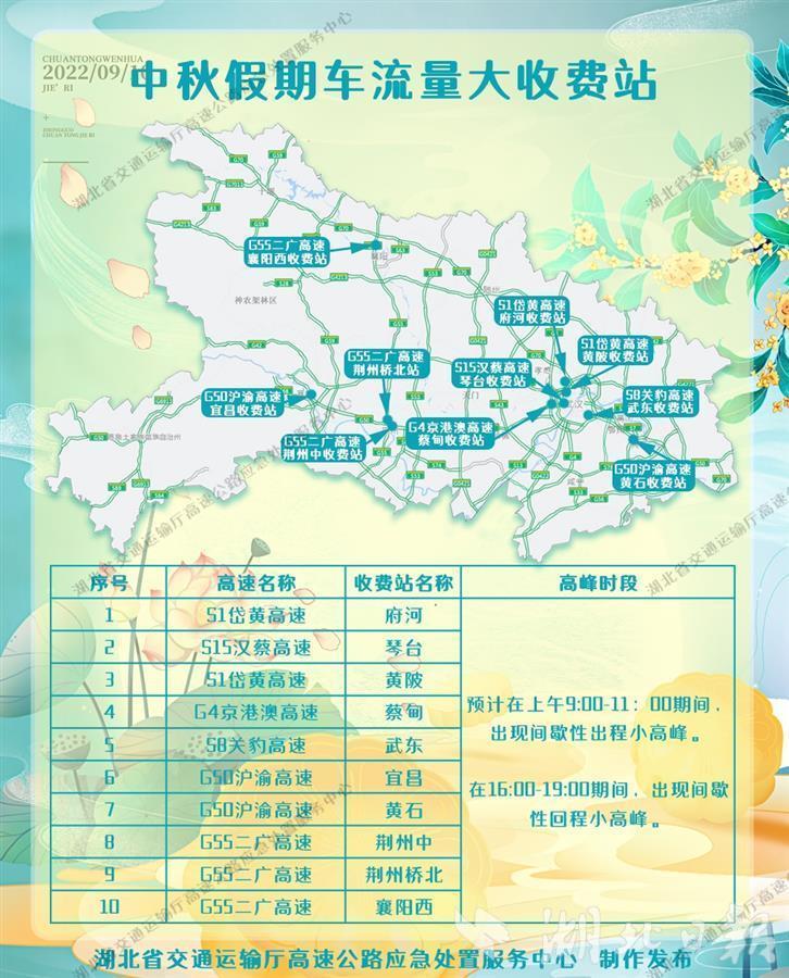 據預計,“中秋”假期全省高速公路出入口車流量約642萬輛,日均約214萬輛,較平日日均流量增長17%。受節假日潮汐車流和地方疫情防控“落地查”政策影響,高速路網車流量將呈現“兩頭高中間低”馬鞍形態勢,預計武漢、宜昌、荊州、襄陽、黃石等大中型城市周邊收費站會出現排隊緩行,時段主要在每天9時至11時出城高峰和16時至19時返程高峰。具體為9月9日(假期前一天)車流量開始上漲,主要集中在大、中型城市收費站進出口,16時至20時出現第一波去程小高峰。9月10日(假期第一天)為假期峰值日,出行車流主要由城市向周邊縣市擴散,9時至11時出現出行高峰。9月12日(假期第三天)返程車流向城市匯集,16時至20時出現返程小高峰。