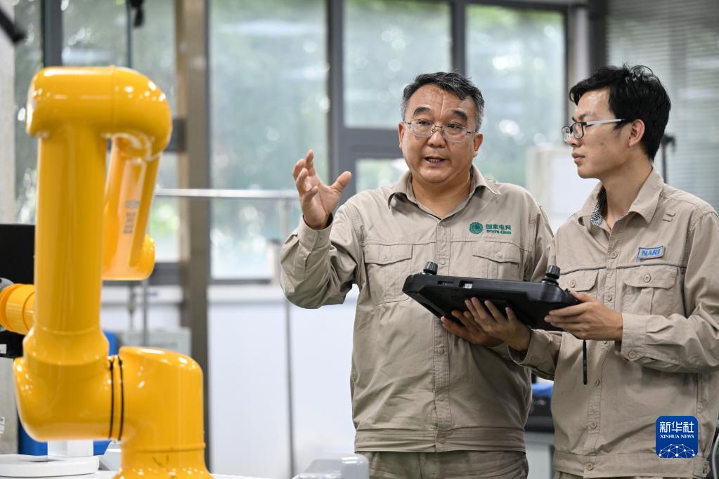 張黎明(左)和同事在調(diào)試第四代配網(wǎng)帶電作業(yè)機器人(2022年9月8日攝)。新華社記者 趙子碩 攝