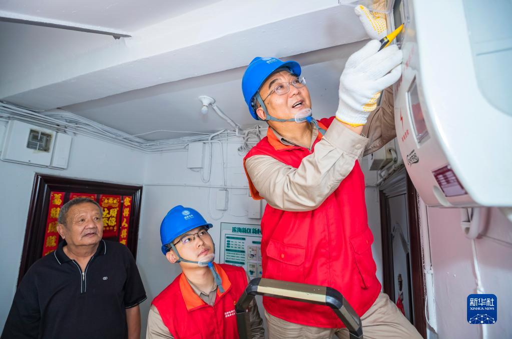 張黎明(右)帶領國網(wǎng)天津濱海黎明共產(chǎn)黨員服務隊到天津市濱海新區(qū)丹東里小區(qū)為居民查看電表(2022年7月15日攝)。新華社發(fā)(李津攝)