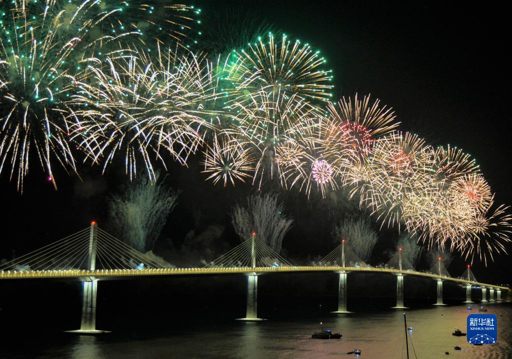 這是在克羅地亞科馬爾納拍攝的由中企承建的佩列沙茨大橋通車儀式上的焰火表演(2022年7月26日攝)。新華社記者 李學軍 攝