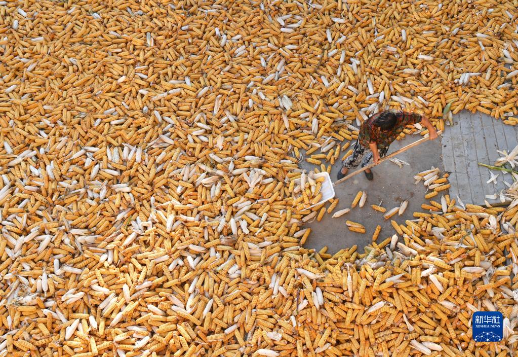 河南省尉氏縣張市鎮沈家村村民將收獲的玉米攤開(9月17日攝)。新華社記者 李嘉南 攝