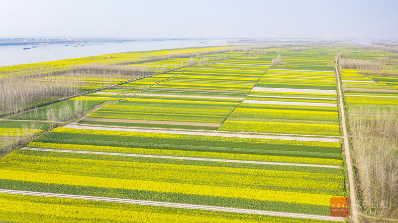 3月11日,嘉魚縣魚岳鎮護縣洲村,金黃的油菜、綠油油的小麥、白色地膜,如一條一條彩帶,把大地描繪得七彩斑斕。