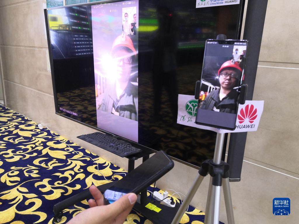 在全國首座5G煤礦潞安化工集團新元公司的調度中心,記者通過5G網絡,視頻采訪井下礦工(2020年5月27日攝)。新華社記者 梁曉飛 攝