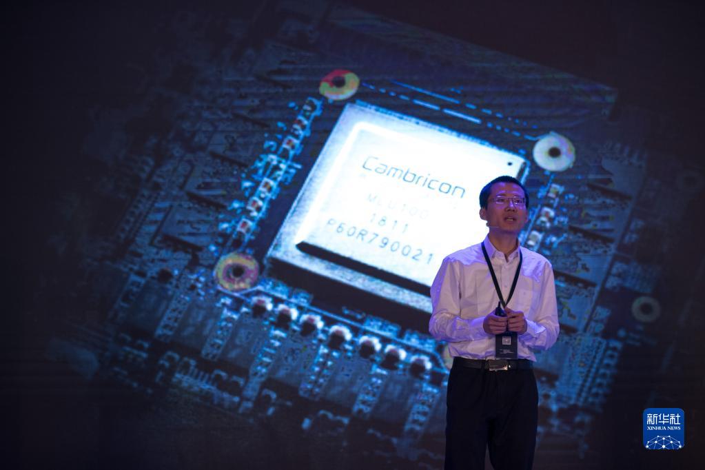 在上海國際會議中心舉行的發布會上,寒武紀科技公司首席執行官陳天石介紹國內首款云端人工智能芯片(2018年5月3日攝)。新華社記者 金立旺 攝