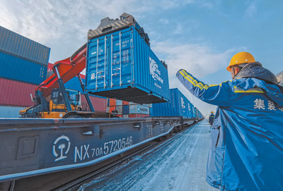 中歐班列助力“一帶一路”沿線國家互聯互通、合作共贏,開行規模不斷擴大。圖為中國鐵路沈陽局集團有限公司職工組織中歐班列裝車。李季春 攝(影像中國)