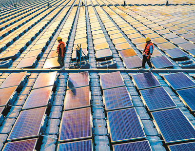 各地加大改革力度,積極發展清潔能源,推動經濟轉型升級。圖為工人們在江蘇省鹽城市射陽縣一光伏發電站進行巡視檢查。馬海峰 攝(影像中國)