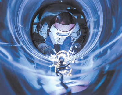 浙江省湖州市德清縣一企業生產車間內,工人正加緊趕制一批高溫高壓染色機外貿訂單。王樹成 攝(影像中國)