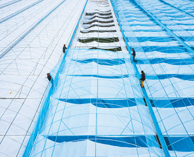 近年來,江西省吉安市新干縣加快構建現代農業體系,激發改革創新和發展活力,助力鄉村振興。圖為新干縣金川鎮長港村現代農業蔬菜產業園內,工人正在給高標準鋼架連棟大棚覆蓋薄膜。李福孫 攝(影像中國)