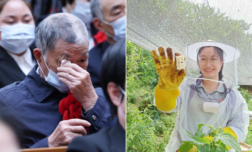 拼版照片:左圖為2021年2月25日,黃文秀的父親黃忠杰在全國(guó)脫貧攻堅(jiān)表彰大會(huì)上(新華社記者 劉彬 攝);右圖為黃文秀生前工作照(資料照片)。