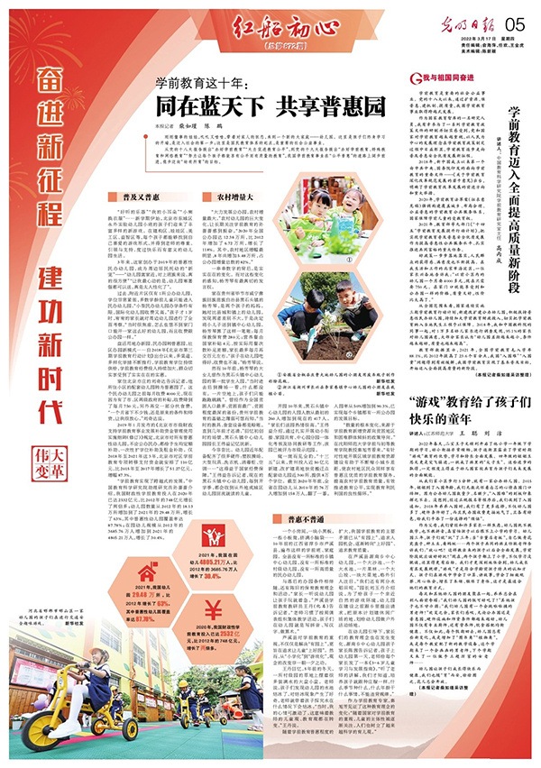 “學前教育實現了跨越式的發展。”中國教育科學研究院助理研究員孫薔薔介紹,我國財政性學前教育投入在2020年已達2532億元,比2012年的748億元增長了兩倍多;幼兒園數量從2012年的18.13萬所增加到了2021年的29.48萬所,增長了63%,其中普惠性幼兒園覆蓋率達87.78%;在園幼兒規模從2012年的3685.76萬人增加到2021年的4805.21萬人,增長了30.4%。
