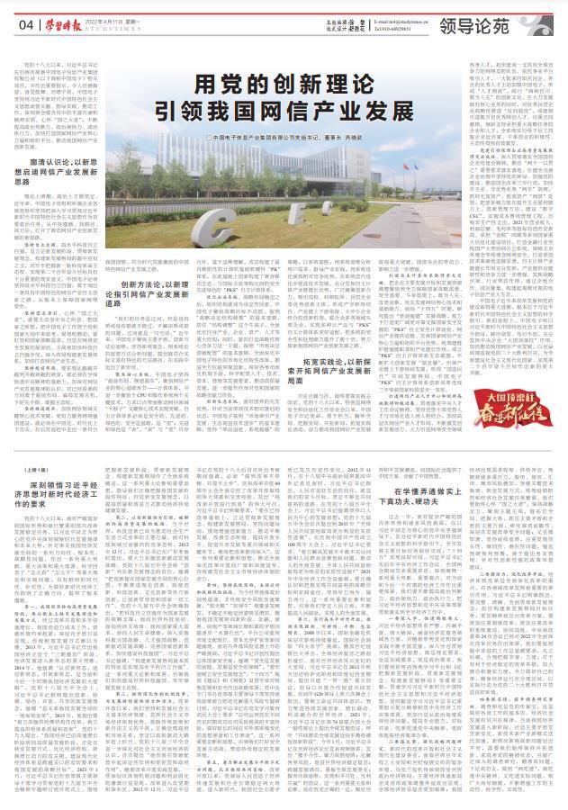 中國電子近年來改革發展和黨的建設取得重大進展,根本在于習近平新時代中國特色社會主義思想的科學指引。新的征程上,中國電子將以習近平新時代中國特色社會主義思想為指導,踔厲奮發、篤行不怠,充分發揮中央企業“大國頂梁柱”作用,加快推動我國網信產業發展,以優異成績迎接黨的二十大勝利召開,為全面建設社會主義現代化國家、實現第二個百年奮斗目標作出新的更大貢獻。