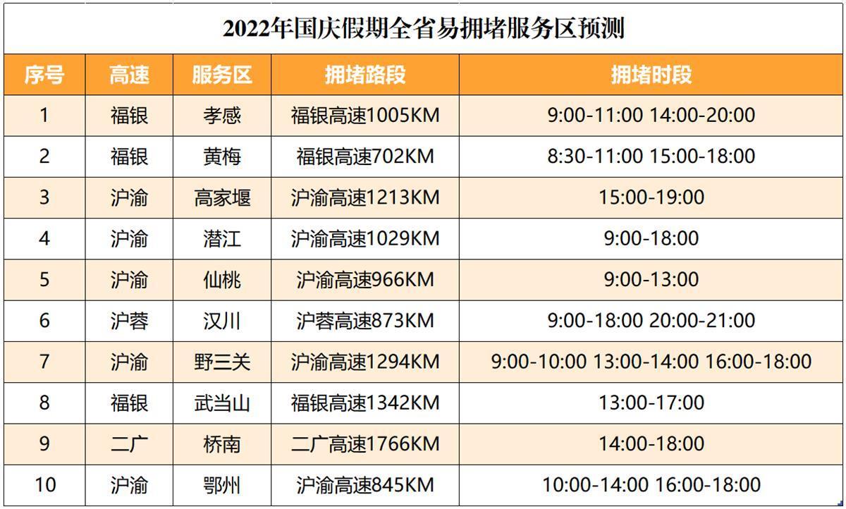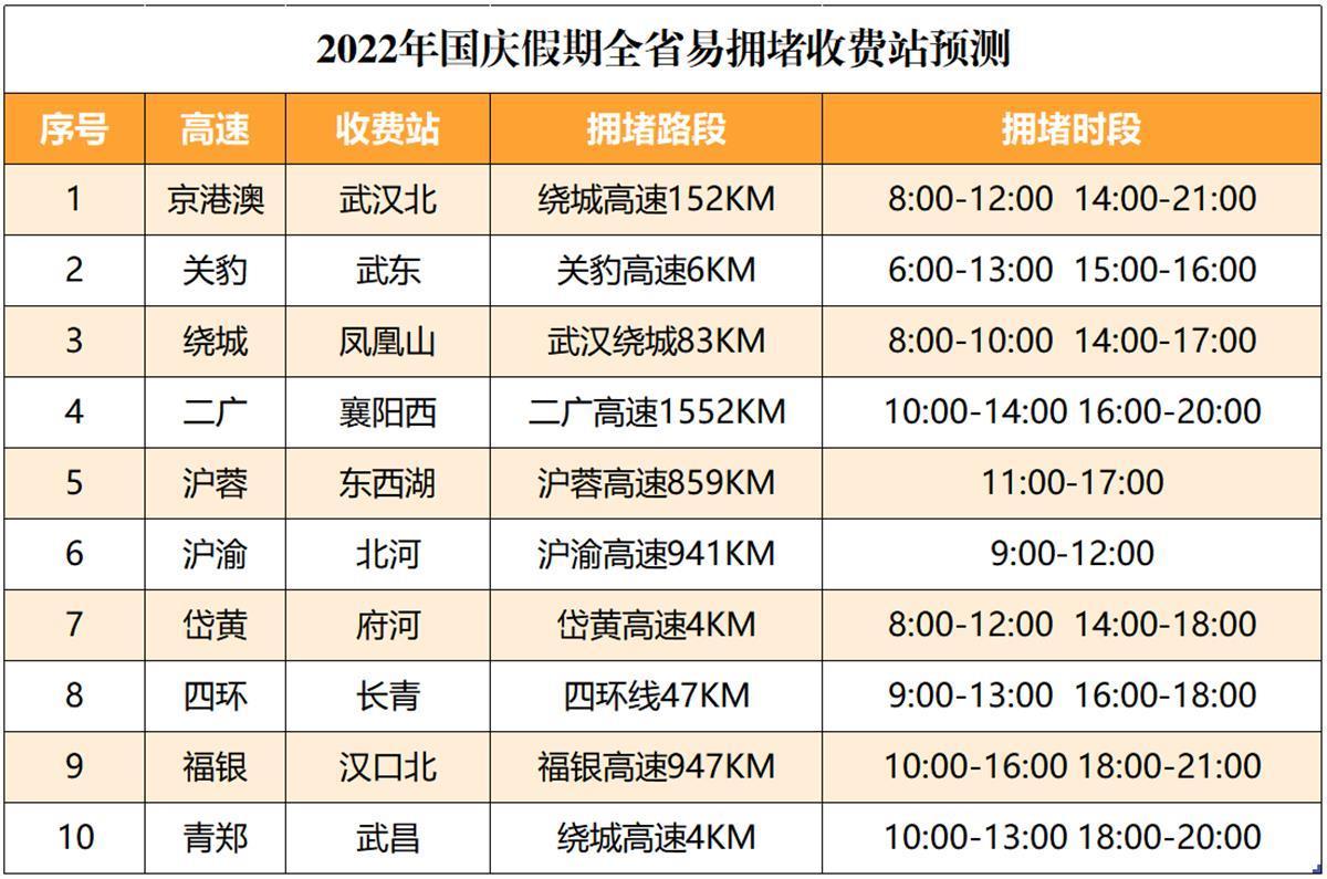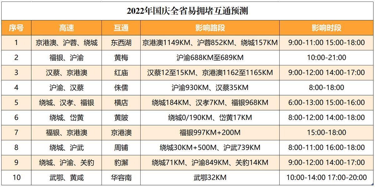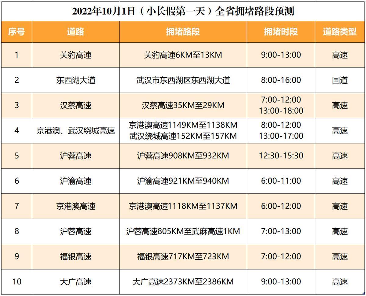 福銀、關豹、岱黃、漢孝、漢蔡、武麻高速等擁堵風險較高。