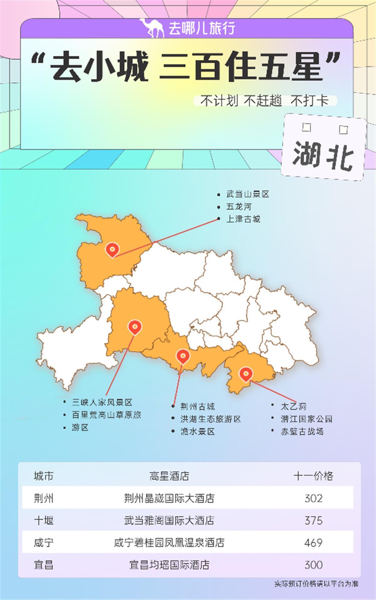 湖北是十一假期熱門旅游目的地,除了眾所周知的武漢,荊州、十堰、宜昌等城市也值得前往。荊州晶崴國際大酒店、武當雅閣國際酒店、宜昌均瑤國際酒店等高星酒店,均有300元左右的房型在售。這些城市周邊旅游資源豐富,如三峽人家風景區、荊州古城、武當山等,旅客既能享受低價高星的酒店服務,又能收獲旅行的快樂。