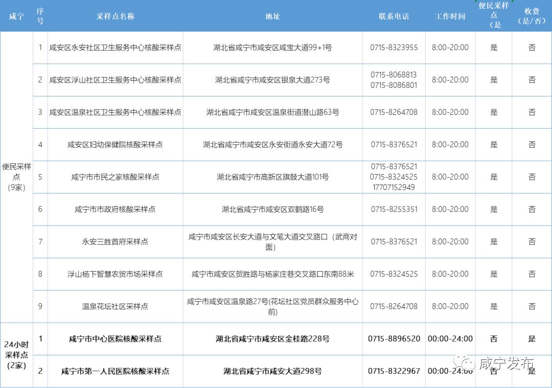 咸寧市主城區(qū)新冠病毒核酸采樣點(diǎn)信息表