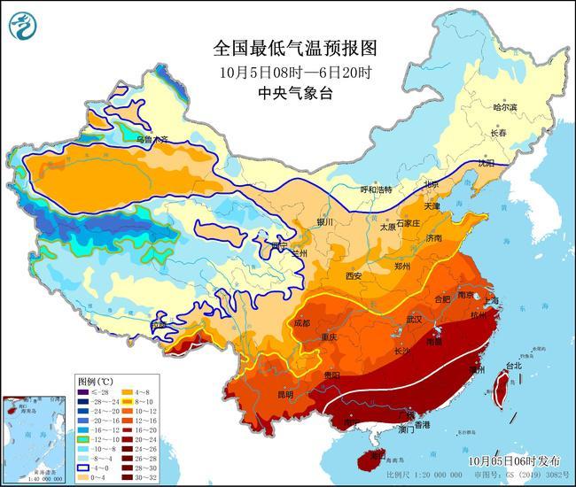 受強冷空氣影響,預計,10月5日08時至10月6日20時,江南大部、西南地區東部、華南北部、青海北部和東部等地部分地區將先后降溫4~6℃,局地降溫幅度可達8℃以上。最低氣溫0℃線將位于華北北部至遼寧中部一帶,最低氣溫10℃線將位于四川東北部、湖北南部、河南南部至蘇皖北部一帶。遼東半島、黃淮東部、江淮東部、江漢東部、江南北部等地部分地區有4~6級偏北風。東海南部、臺灣海峽有6~7級東北風,臺灣海峽部分海域風力可達8級,陣風9級。