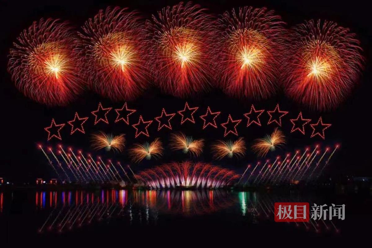 咸寧蜜泉湖旅游度假區300米高空巨幅煙火“盛世中華”璀璨綻放,焰光下萬人齊唱《我和我的祖國》。