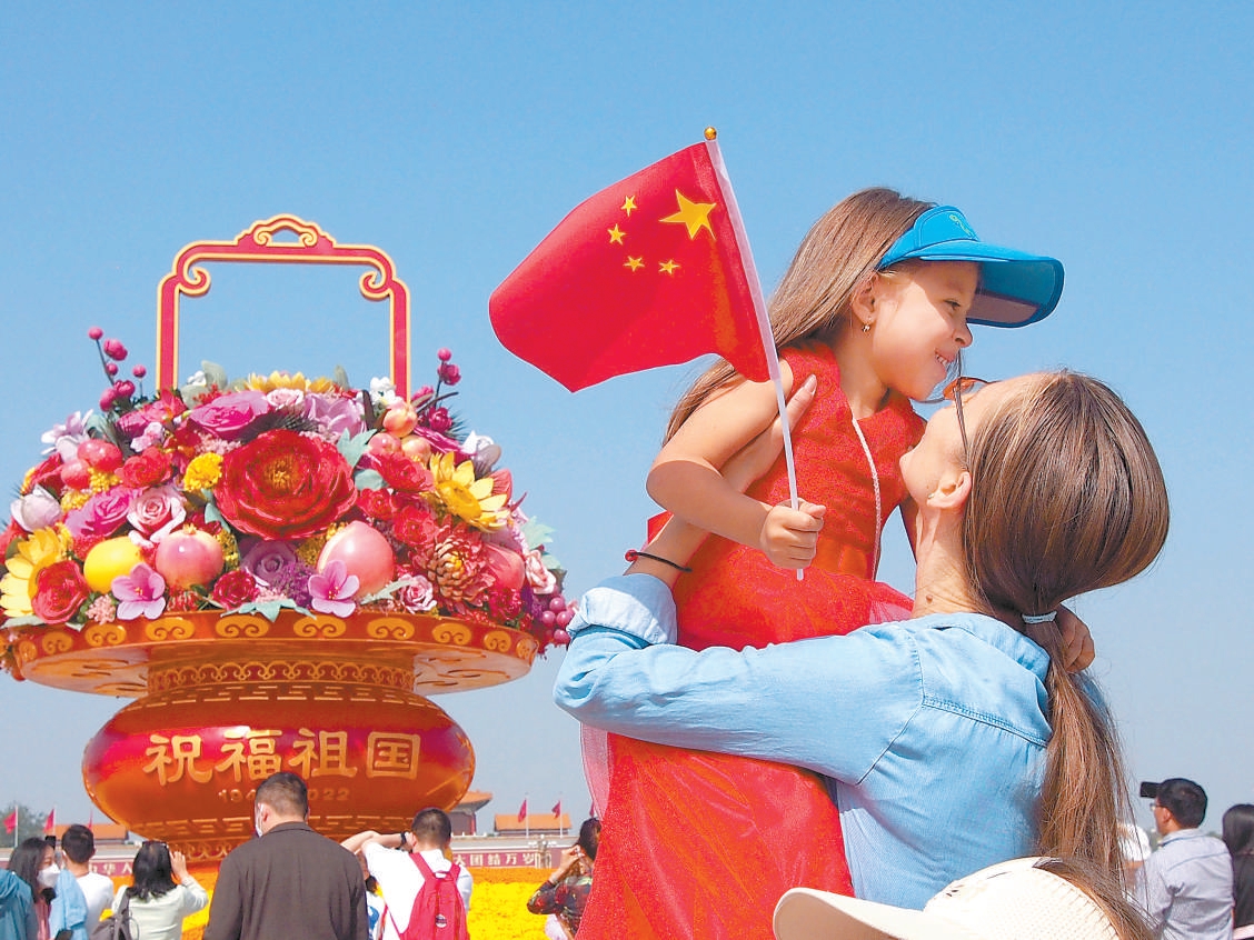 天安門廣場上,一對母女在“祝福祖國”巨型花果籃前拍照留影。(杜建坡 攝)