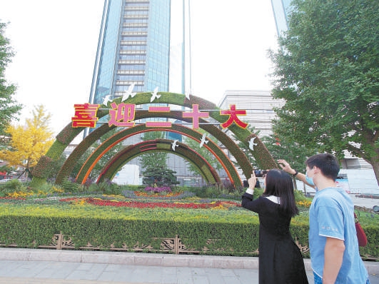 在北京雙子座大廈前,市民拍攝“喜迎盛會”花壇。(杜建坡 攝)