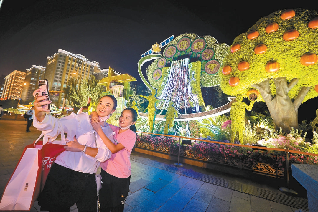9月28日晚,在東單路口西南角“共享發展”花壇前,一對母女自拍。(鄧偉 攝)