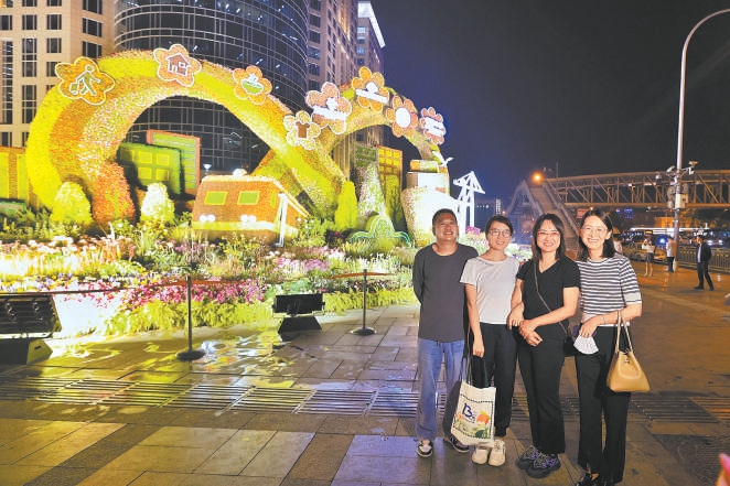 9月28日晚,在東單路口西北角“開放發展”花壇前,市民合影留念。(鄧偉 攝)