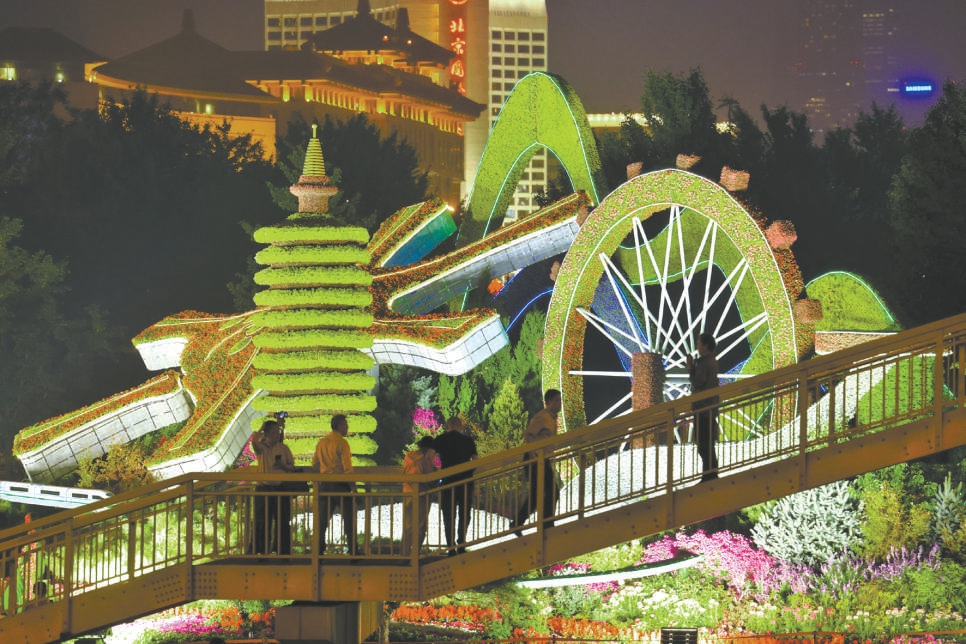 9月28日晚,在東單路口南側人行天橋,很多市民駐足觀賞“協調發展”花壇。(鄧偉  攝)