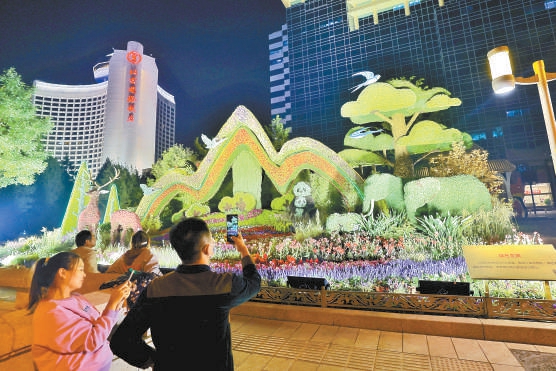 暮色四合,長安街燈光璀璨。14座立體花壇成為熱門打卡地,市民走上街頭欣賞花壇,祝福祖國。
