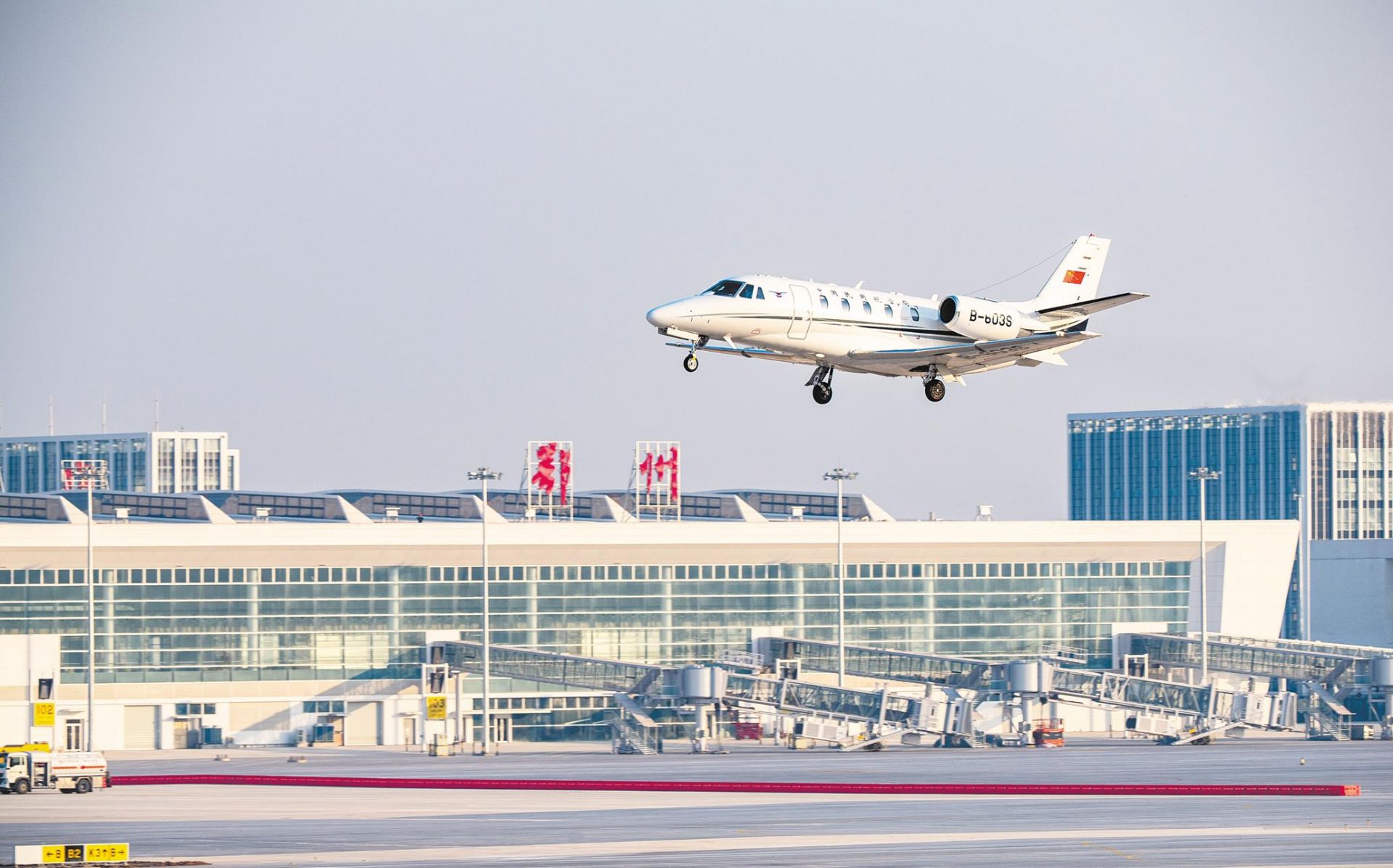2021年12月29日,一架C—560型校驗飛機在鄂州花湖機場西跑道校飛。