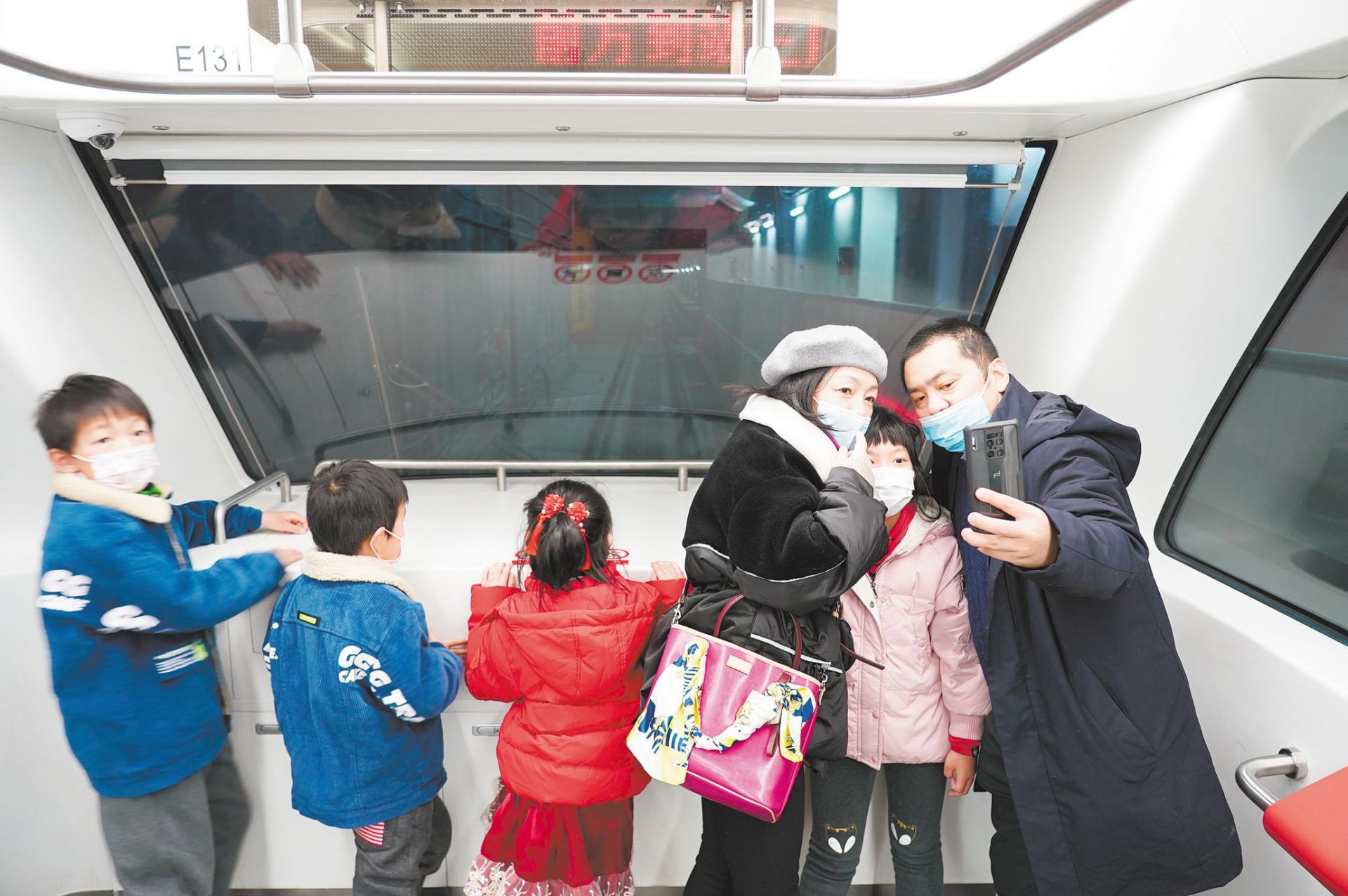 2021年12月31日,武漢地鐵5號線上,乘客在車頭、車尾擋風玻璃前拍照留影。