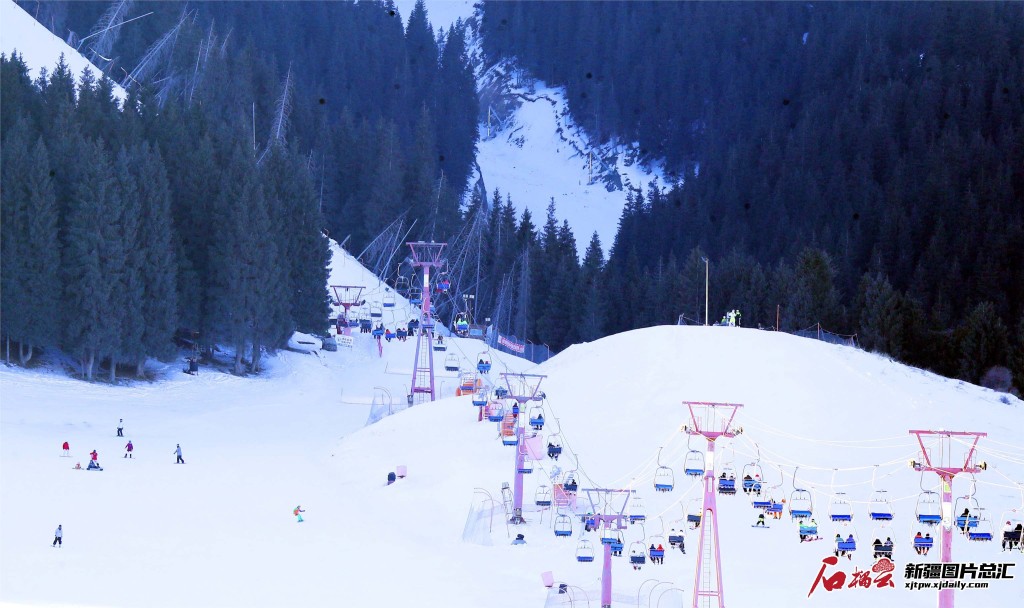 滑雪愛好者與游客在位于烏魯木齊市的絲綢之路國際度假區滑雪場滑雪休閑(2021年12月26日攝)。(攝影:張秀科)