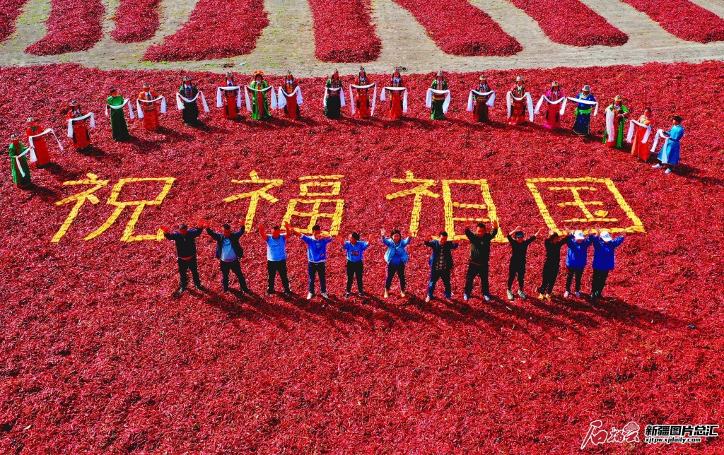 巴音郭楞蒙古自治州博湖縣烏蘭再格森鄉農民用辣椒和玉米擺出“祝福祖國”字樣,表達豐收喜悅,祝福祖國繁榮昌盛(2020年10月1日攝)。(攝影:年磊)