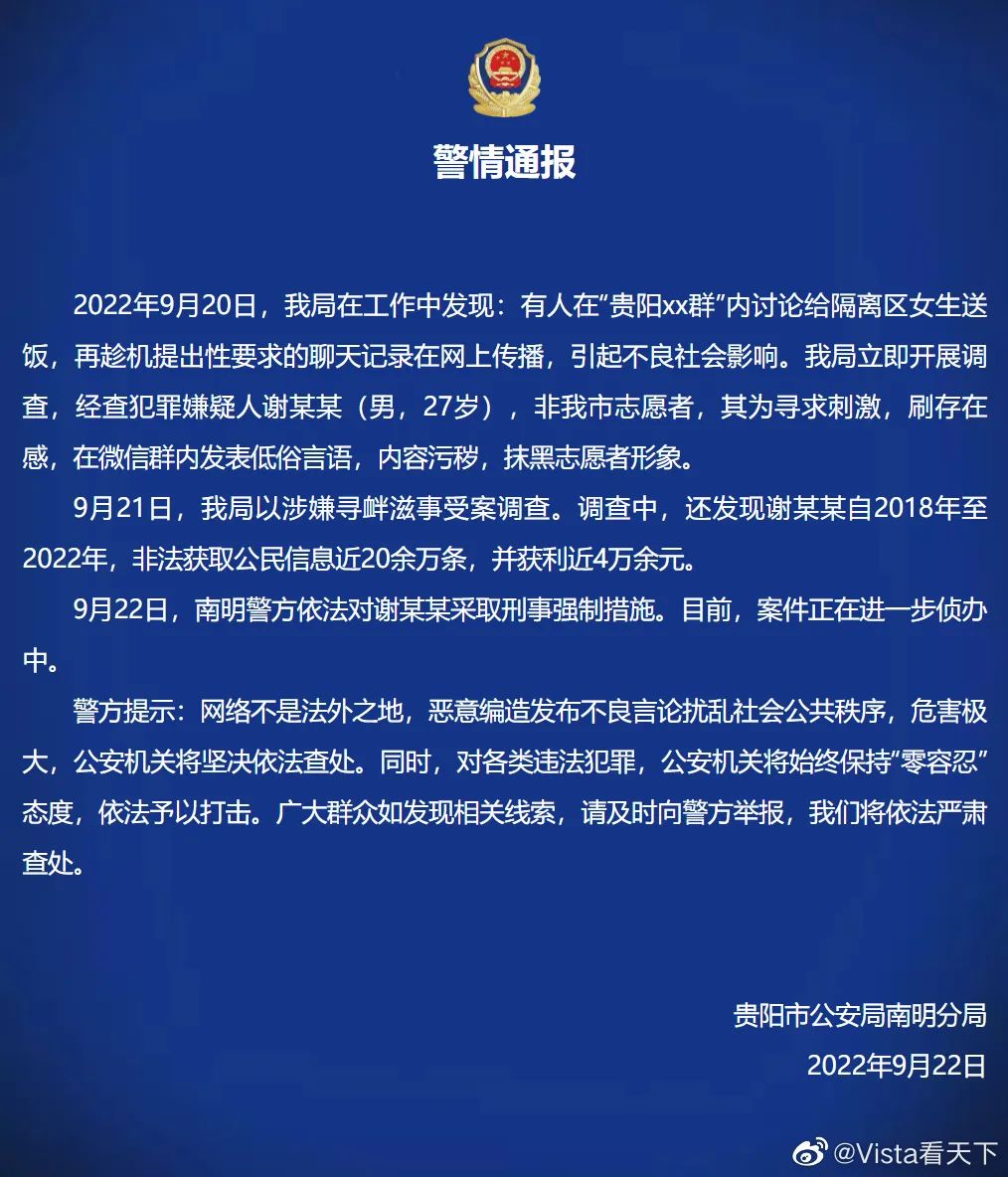 9月22日,貴州省貴陽(yáng)市公安局南明分局發(fā)布通報(bào),9月20日,該局在工作中發(fā)現(xiàn):有人在“貴陽(yáng)xx群”內(nèi)討論給隔離區(qū)女生送飯,再趁機(jī)提出性要求的聊天記錄在網(wǎng)上傳播,引起不良社會(huì)影響。