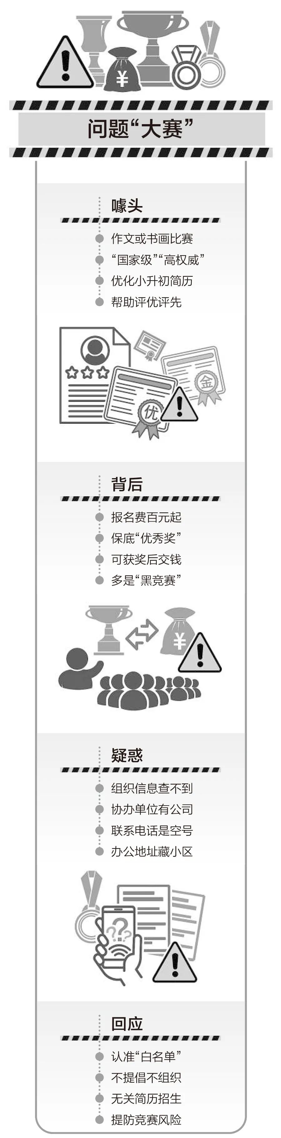 “違規競賽!”近期,教育部回應了群眾反映的“葉圣陶杯”華人青少年作文大賽,引發社會關注。記者調查發現,如今以中小學生和家長為目標的各類違規競賽依舊不少。不少“大賽”動輒標榜“國家級”,但“交錢就有獎”,其背后問題重重。“三大寫作賽事之一,‘為學杯’征稿中。”一家社交平臺上,有人發布這樣的比賽廣告,引得不少家長跟帖咨詢如何參賽。廣告中,宣稱“為學杯”作文大賽和“葉圣陶杯”“冰心杯”齊名,屬于“國家級”寫作賽事。而當詢問是否還能報名“葉圣陶杯”作文比賽時,其表示已于2月16日截止了。這樣“高端”的作文比賽廣告,不是個例。還有中介整理出一份“2023年比賽清單”,其中更是包含了多個面向全國中小學生的各類作文、書畫比賽。而這些比賽,都被宣稱為“高權威、高含金量中小學比賽。”五花八門的比賽動輒被宣傳形容為“國家級”“全國性”“高權威”等字眼,有的甚至直接在比賽中冠以“中國”之名,乍一看噱頭十足。在中國少兒藝術網上,第十三屆中國少兒書畫攝影大賽就正在進行中。從征稿函來看,參賽主題不限、作品種類不限、作品尺寸和規格不限、每個學生投稿數量也不限,幾乎談不上有任何門檻。盡管大賽每年一屆,但每屆分春夏秋冬四個季賽,全年可隨時投稿。“大賽秉承激勵和賞識的教育理念,參賽作品獎設置豐富。”獎項設置一欄顯示,每1萬幅作品中設特別金獎200名,金獎1000名,銀獎2500名,銅獎4000名,其余為優秀獎。在評獎方面同樣“慷慨”的還有第十四屆“飛翔中國”全國青少年兒童書畫攝影活動。從征稿函來看,本屆獲獎作品分設“小藝術家人才獎”5‰,特等獎1%、一等獎25%、二等獎30%、三等獎30%、優秀獎若干。參加這些比賽,究竟有什么用呢?咨詢多位負責代報名的“老師”后,他們大多拿孩子的升學或“評優評先”的簡歷說事。“主要是小升初簡歷優化為主。”“可以豐富簡歷”。而也有人直接宣稱可以輔助評優評先,“中小學生簡歷豐富、評優評先都需要有全國性的權威賽事證書支撐……照著清單準備起來,杠杠地靠譜!”這些名目繁多的作文、書畫比賽,參賽難度如何,獲獎希望大嗎?經過調查,記者發現多個比賽的難度偏低。至少在宣傳環節上,幾乎都是變相“交錢拿獎”。“小孩以鼓勵為主,你們集體的可以老師進行初評。”記者以培訓機構老師的身份咨詢是否交錢就能有獎杯時,第七屆“中國希望杯”全國青少年兒童書畫攝影大賽工作人員言辭閃爍,而征稿函在參加辦法中明確表示,每位參賽作者收取報名費100元,組委會將頒發獲獎證書,授予“新時代經典小藝術家”榮譽勛章1枚,贈送新款保溫杯1個,并強調勛章的正面上方是國徽,下方是天安門和華表,背面刻有中國希望杯全國青少年書畫攝影大賽字樣,高檔錦盒包裝,極具收藏紀念價值。此外,征稿函還提到,凡交納185元的作者,贈送榮譽獎杯1個,凡交納300元的作者,額外贈送畫冊一本,并把獲獎作品印在畫冊上。“參賽有保底”“最低優秀獎”,這是不少代報名老師口中的第十九屆“為學杯”中小學作文大賽。兩位不同機構的代報名老師均表示,參與這項比賽,最低都能獲得優秀獎,會有證書、作文書籍。至于參賽,一個報名老師表示直接進入復審階段,其發來的一個團購鏈接顯示,“復審需繳納100元費用作為資料費”,已有153人團購報名;而如果晉級全國決選,參賽費用則為560元。第十四屆“飛翔中國”全國青少年兒童書畫攝影活動則規定,獲獎小作者可預訂“水晶獎杯”,定價為130元;“精美飛翔獎杯”,定價為180元;“木質獲獎牌匾”,定價為140元。“可以參賽時候交,也可以獲獎后再交。”組委會工作人員稱,參賽學生都能獲獎,根據作品來評定等級。培訓機構的老師可以在學生參賽時給出初評意見,組委會評委會參考。今年1月31日,教育部在官網發布了《關于共同抵制面向中小學生違規競賽活動的提醒》。其中談到,凡未列入教育部公布的《2022—2025學年面向中小學生的全國性競賽活動名單》的,均屬違規舉辦的“黑競賽”。記者查詢以上多個賽事發現,均未入列此名單。也就是說,以上比賽都是違規舉辦的“黑競賽”。調查發現,以上比賽不只不在教育部發布的名單之中,且在身份和相關信息上都有疑問。有的主辦方查不到相關信息,有的電話是空號,實地探訪也撲空。以第十四屆“飛翔中國”全國青少年兒童書畫攝影活動為例。征稿函顯示,該活動的主辦單位為中國青少年書畫藝術協會。在協會概況中,聲稱協會是經政府批準成立具有獨立法人資格的社會團體。然而,記者進入全國社會組織信用信息公示平臺進行社會組織查詢,發現結果中,并沒有顯示有該組織。第十三屆中國少兒書畫攝影大賽,主辦單位為中國少兒藝術教育協會。記者從全國社會組織信用信息公示平臺上進行社會組織查詢,同樣沒有看到該組織。記者注意到,比賽的協辦單位包括中國少兒藝術有限公司。在天眼查上搜索,發現該公司于2012年在香港注冊成立。而第十九屆“為學杯”全國中小學生創新作文大賽的主辦方同樣讓人迷惑。多個比賽的宣傳廣告中顯示,其主辦單位為中國修辭學會讀寫教學研究會、《為學作文》編輯部。然而,記者連續多次撥打主辦方留下的兩個聯系電話,均未能接通。其中一個提示是“空號”,另一個電話則被12人標記為“騷擾電話