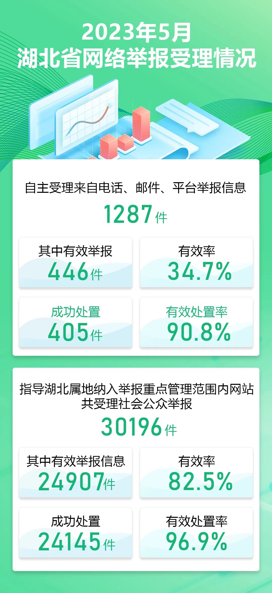 5月份,舉報(bào)中心自主受理來(lái)自電話、郵件、平臺(tái)舉報(bào)信息1287件,其中有效舉報(bào)446件,有效率34.7%,成功處置405件,有效處置率90.8%;指導(dǎo)湖北屬地納入舉報(bào)重點(diǎn)管理范圍內(nèi)網(wǎng)站共受理社會(huì)公眾舉報(bào)30196件,其中有效舉報(bào)信息24907件,有效率82.5%,成功處置24145件,有效處置率96.9%。