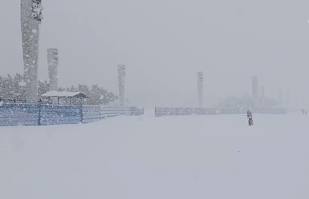 煙臺大學東門附近,冷流雪正在狂暴,宛如北極科考。微博網友視頻截圖