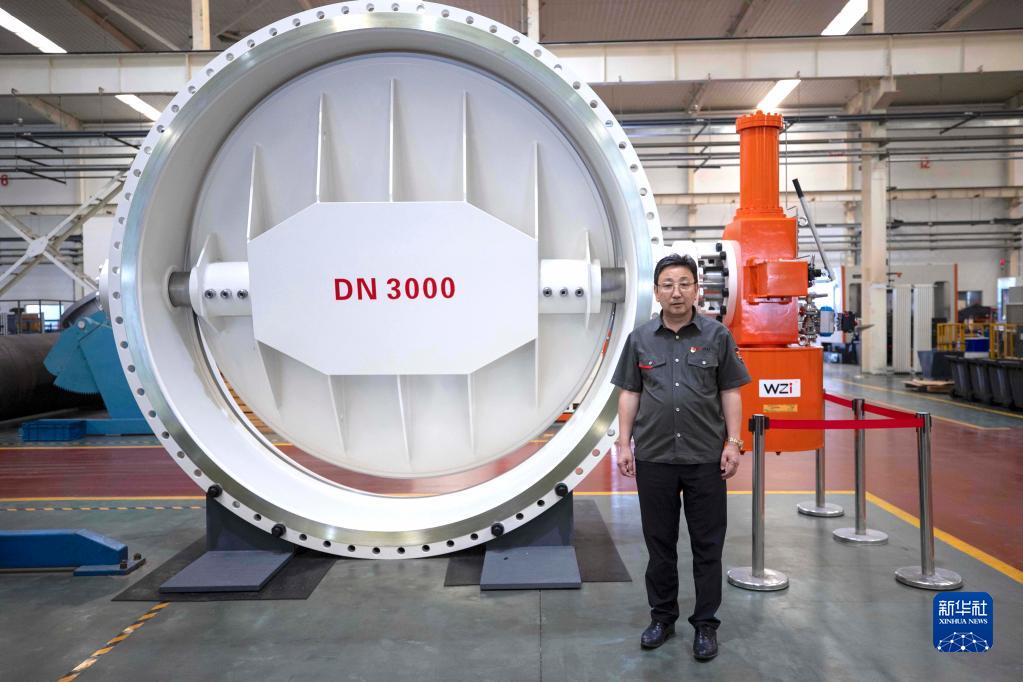 馬玉山在位于寧夏吳忠市的吳忠儀表有限責任公司自動化產業園數字化裝配車間中,左側為該公司生產的DN3000三偏心蝶閥(9月12日攝)。 新華社記者 楊植森 攝