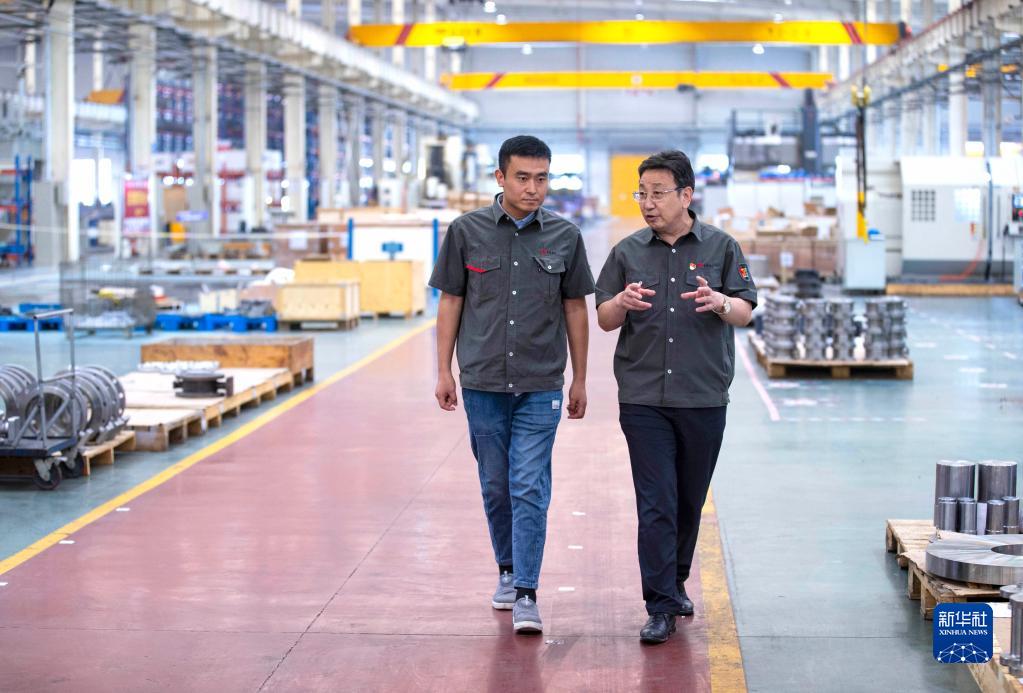 在位于寧夏吳忠市的吳忠儀表有限責任公司自動化產業園數字化裝配車間內,馬玉山(右)與技術人員交流(9月12日攝)?!⌒氯A社記者 楊植森 攝