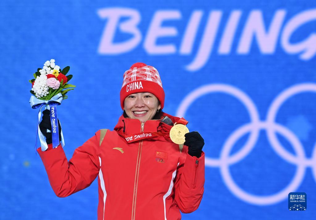 徐夢桃在張家口賽區頒獎廣場舉行的北京2022年冬奧會自由式滑雪女子空中技巧獎牌頒發儀式上慶祝(2022年2月15日攝)。新華社記者 胡虎虎 攝